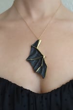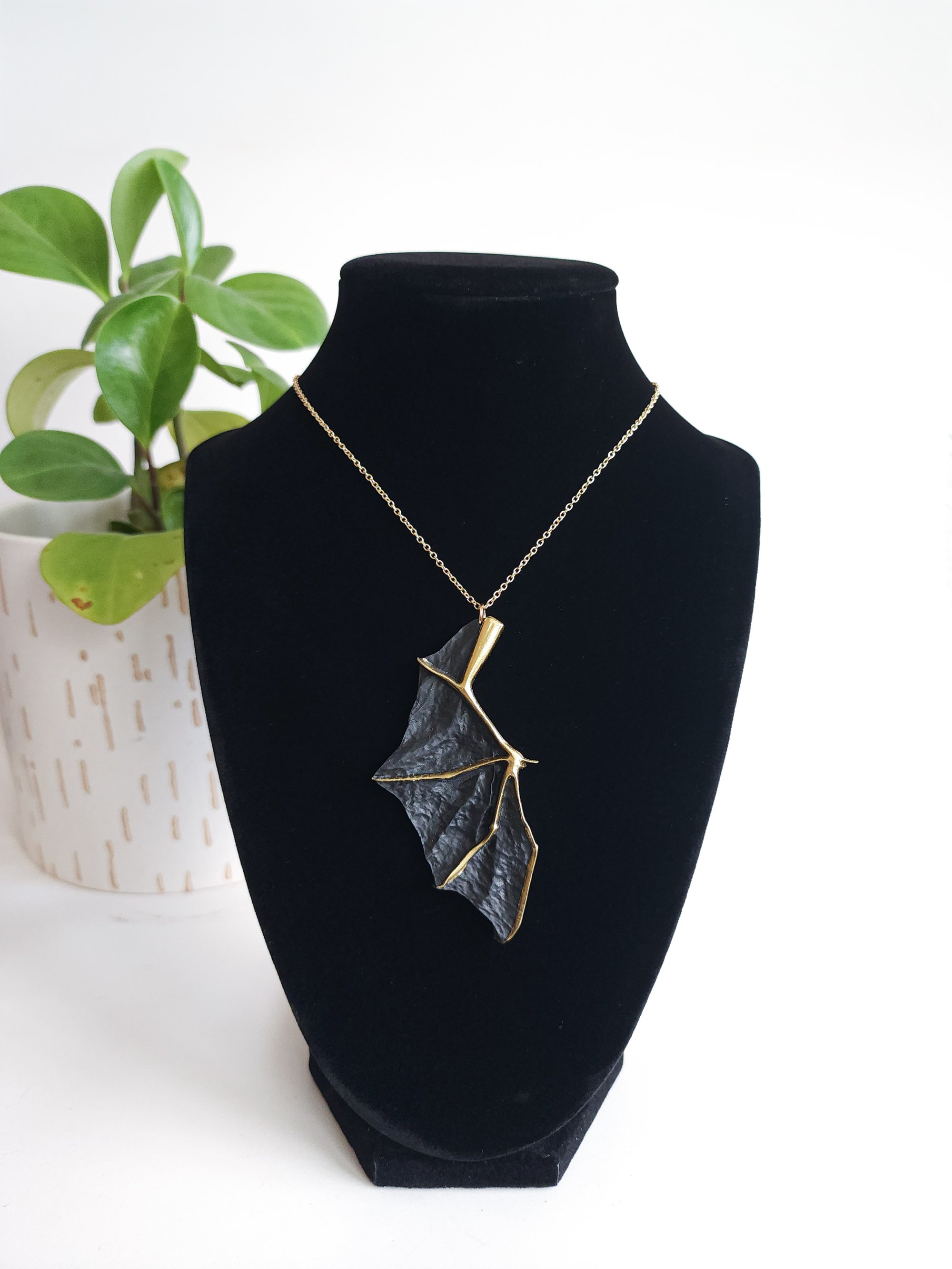 Black polymer clay bat wing pendant with gold accents on a gold 16" chain, safe and lightweight to wear. The chain is nickel-free and hypoallergenic, it is also corrosion and stain resistant.