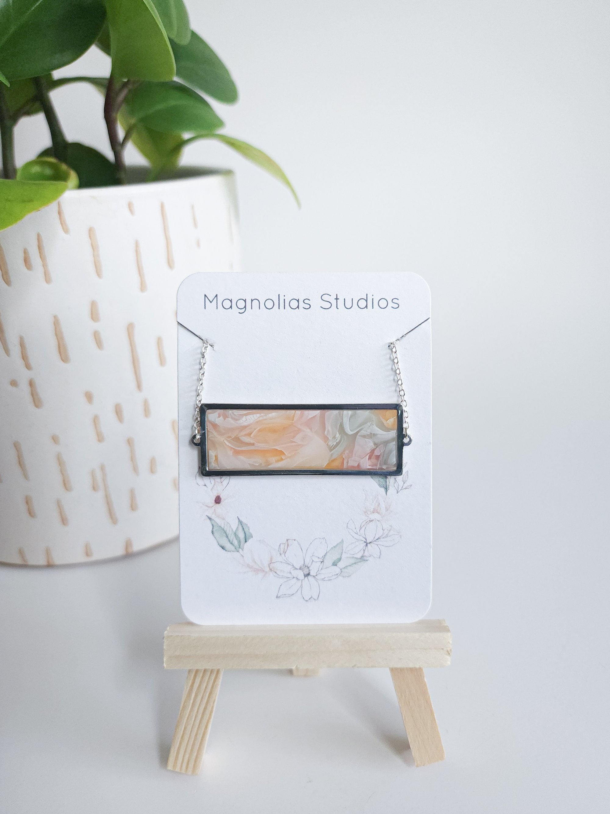 Peaches Marble pendant in a silver bezel with a silver 16" chain, safe and lightweight to wear. The chain is nickel-free and hypoallergenic, it is also corrosion and stain resistant.