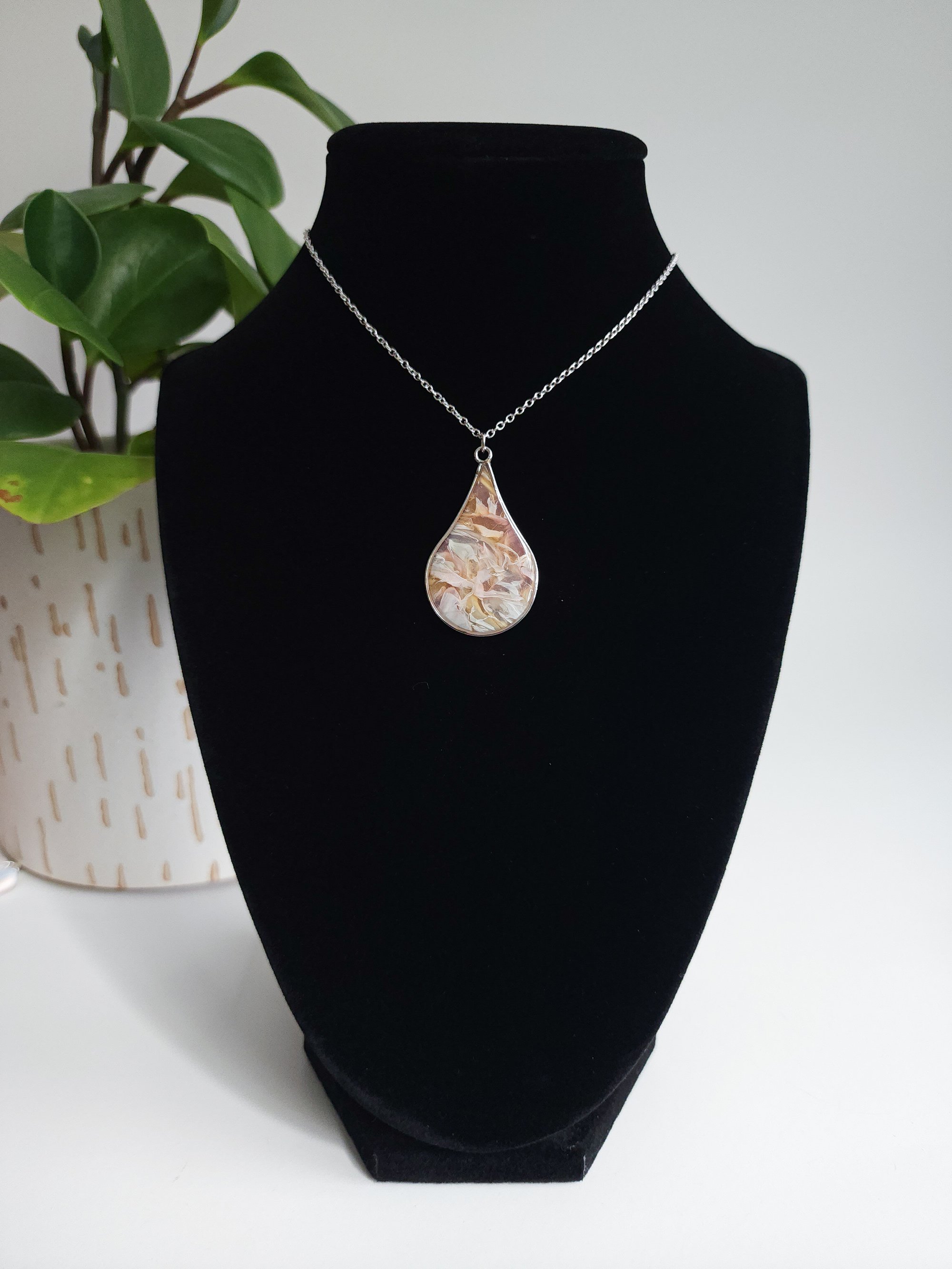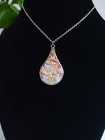 Peaches Marble pendant in a silver bezel with a silver 16" chain, safe and lightweight to wear. The chain is nickel-free and hypoallergenic, it is also corrosion and stain resistant.