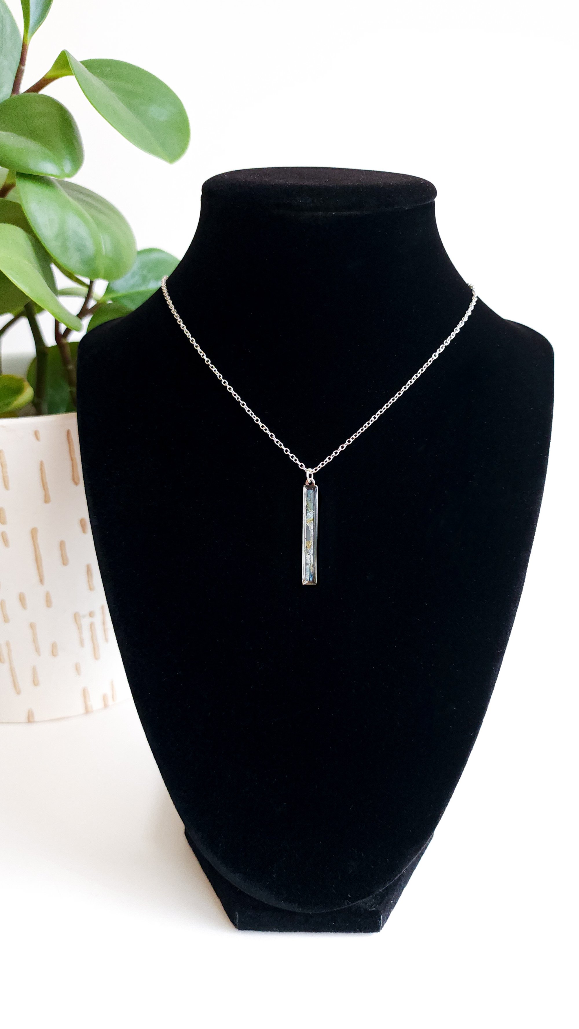 Sandbar Marble pendant in a silver bezel with a silver 16" chain, safe and lightweight to wear. The chain is nickel-free and hypoallergenic, it is also corrosion and stain resistant.