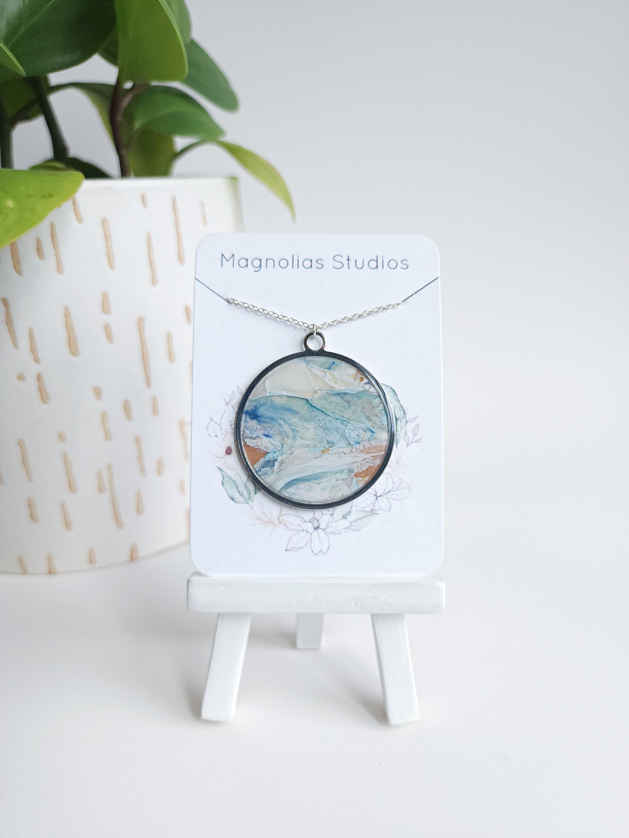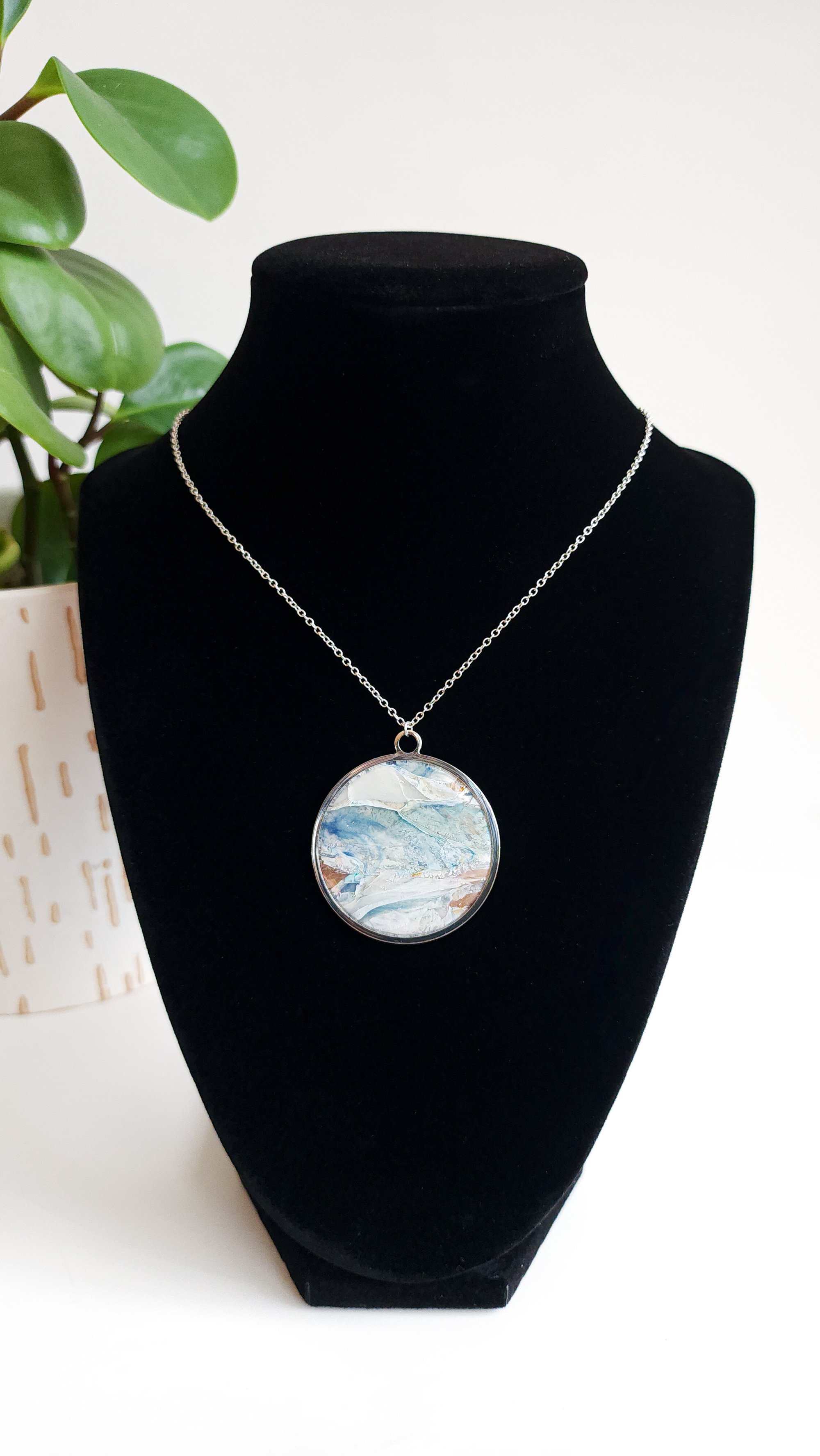 Sandbar Marble pendant in a silver bezel with a silver 16" chain, safe and lightweight to wear. The chain is nickel-free and hypoallergenic, it is also corrosion and stain resistant.