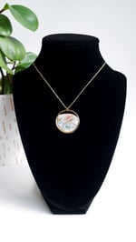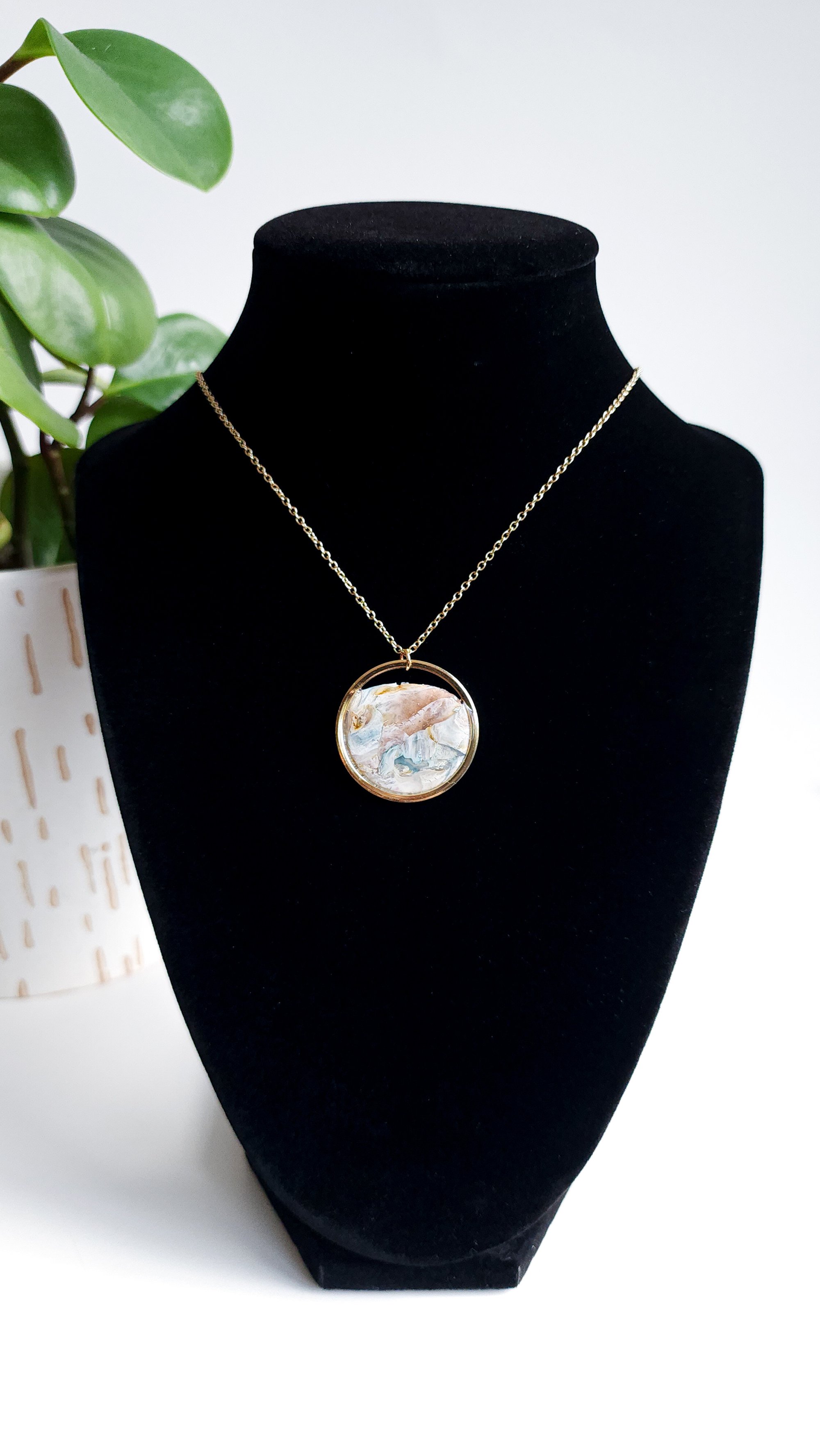 Sandbar Marble pendant in a gold bezel with a gold 16" chain, safe and lightweight to wear. The chain is nickel-free and hypoallergenic, it is also corrosion and stain resistant.
