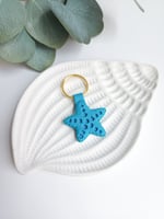 Polymer clay starfish keychain with a faux leather texture. It's on a gold 1" jump ring with a lobster clasp. The hardware is nickel-free and hypoallergenic.
